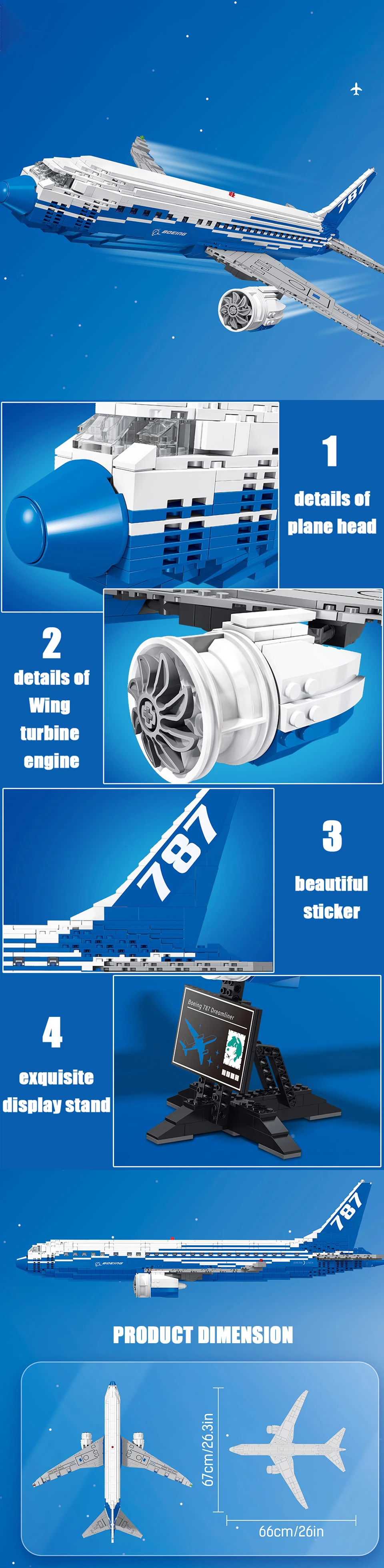 Ce jeu de construction aéronautique permet de réaliser une réplique détaillée d’un avion de ligne moderne de type 787, reconnu pour son design élancé et ses lignes contemporaines. Conçu avec soin, ce modèle offre un rendu visuel réaliste et équilibré, idéal pour les passionnés d’aviation et de constructions détaillées.